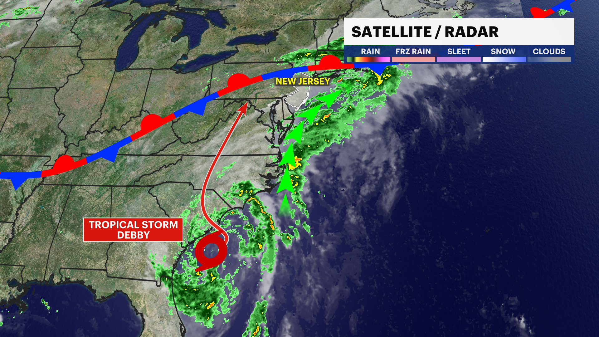 WHAT: Tropical Storm Debby's moisture is expected to pass to the west of New Jersey, producing rounds of downpours and flooding that pass-through New Jersey for the afternoon and evening. Currently, rainfall can exceed 1-3" across New Jersey for the afternoon batch of rain, but the heaviest of the rain stays over Pennsylvania through the day. Debby's center is like to pass by west and north of New Jersey sometime on Friday midday, but the backside of the storm is drier and breezy. Rapid improvement is expected overnight Friday into Saturday morning with a great weekend in the forecast. Thunderstorms that form on Friday afternoon have the likelihood of producing widespread flash flooding and strong/damaging wind gusts.