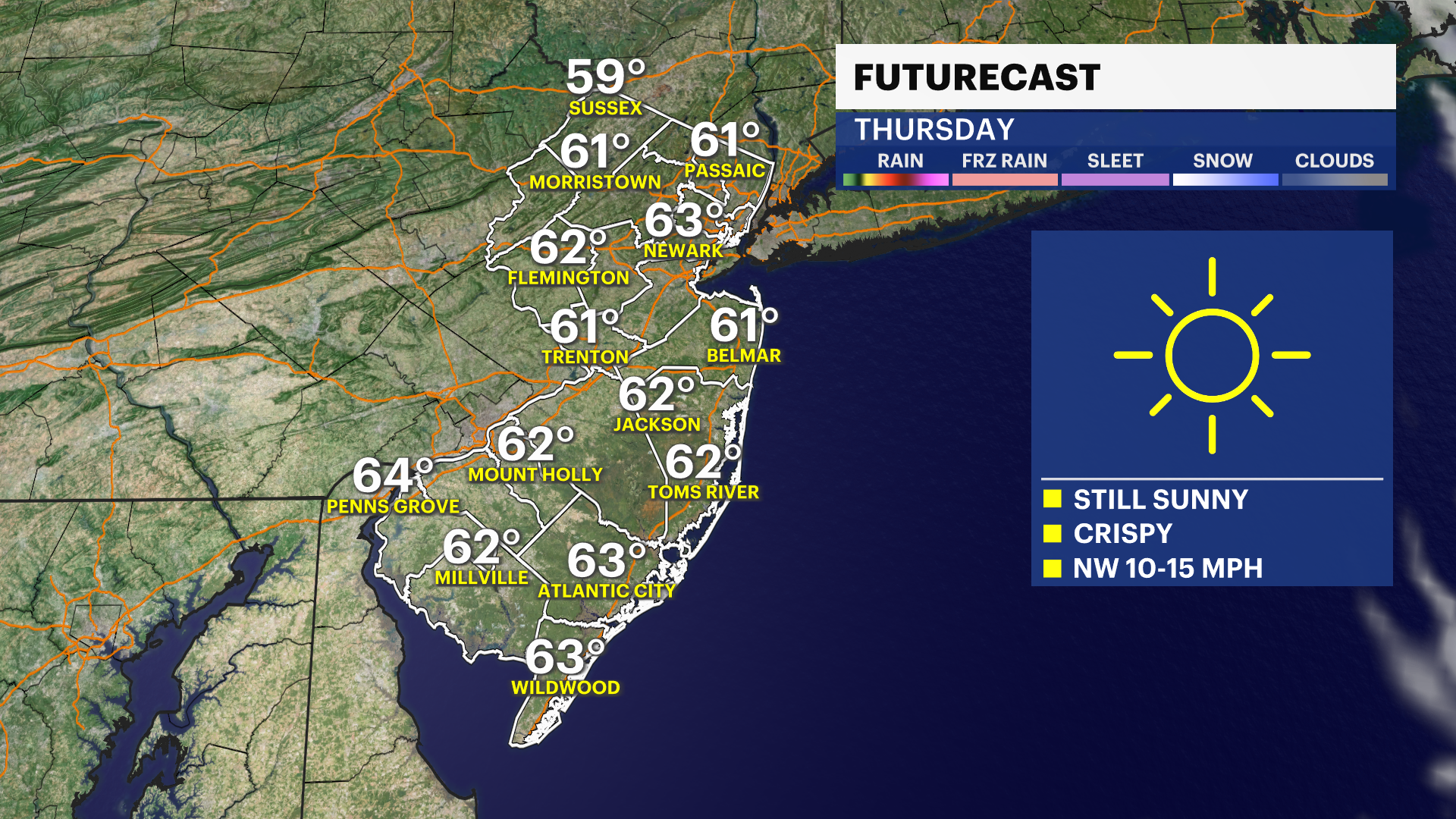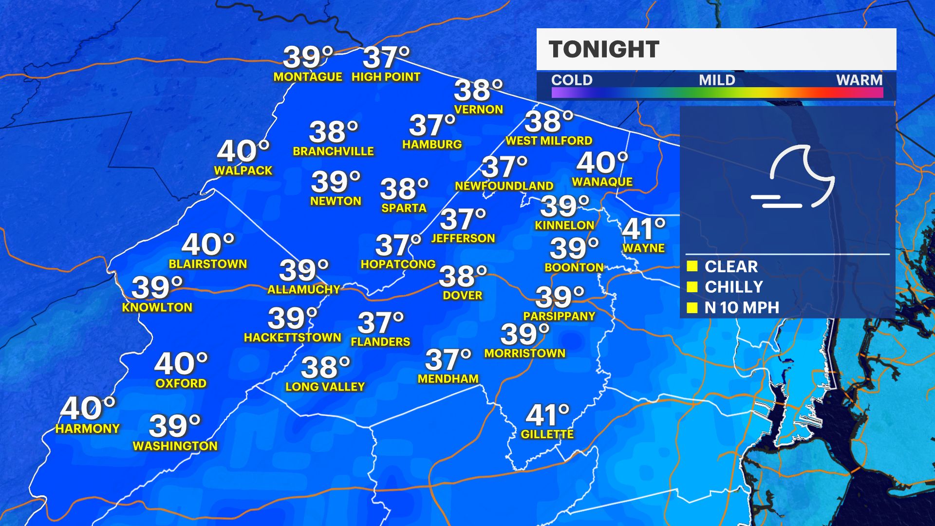 Tonight's lows will be in the upper 30s in NW New Jersey and in the mid-40s elsewhere.