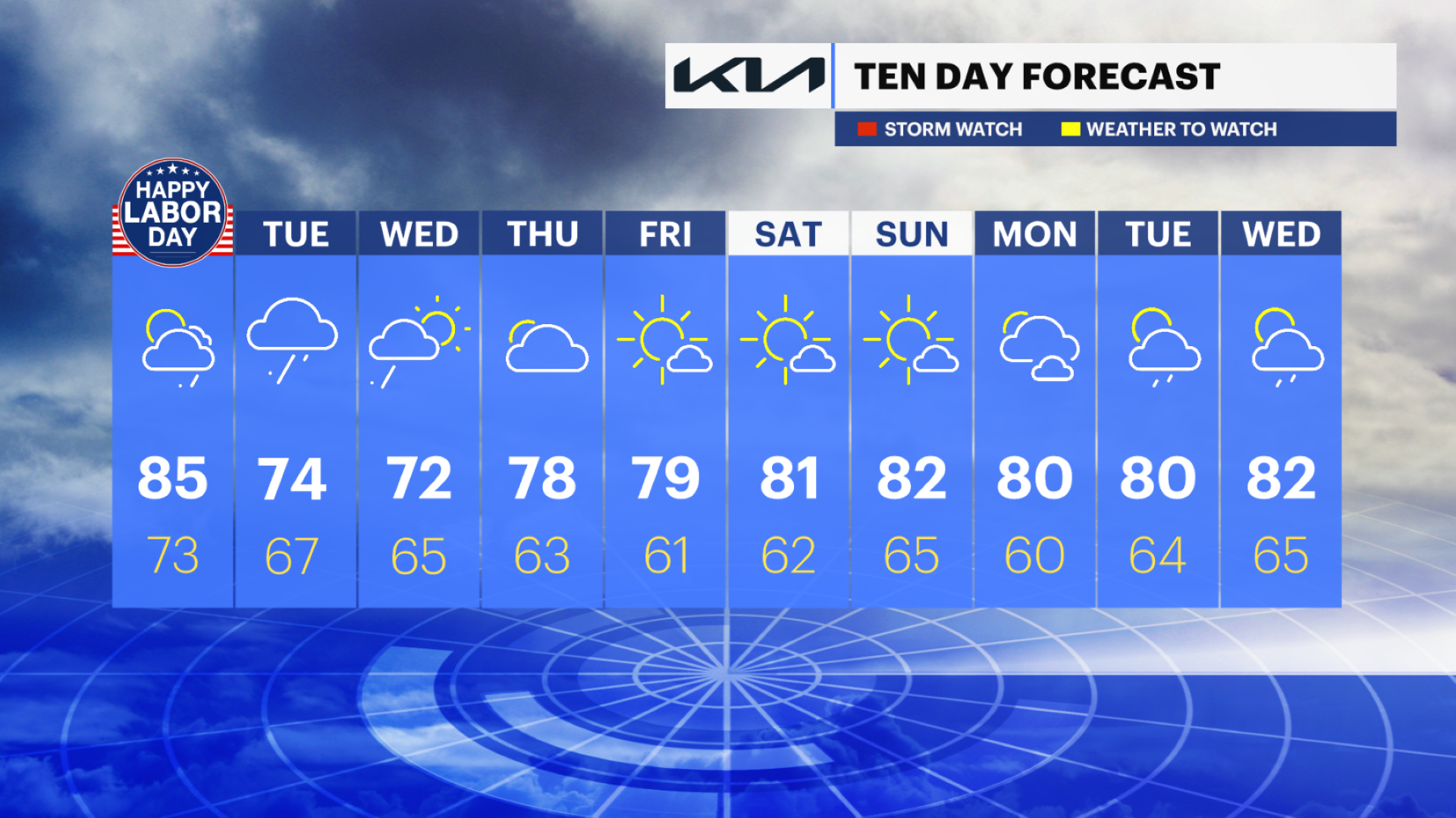 SATURDAY: Partly cloudy. Highs in the low-80s.