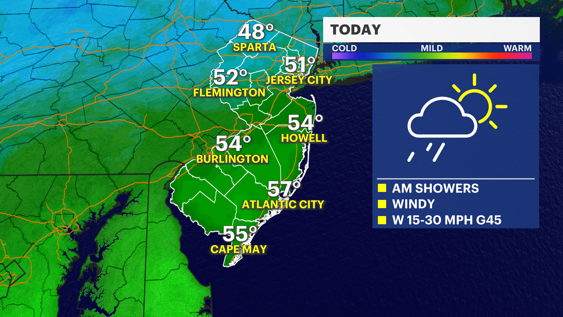 Today: Morning showers. Becoming partly sunny this afternoon. Windy. Highs in the upper 40s and lower 50s. Temperatures will fall into the 30s by sunset.