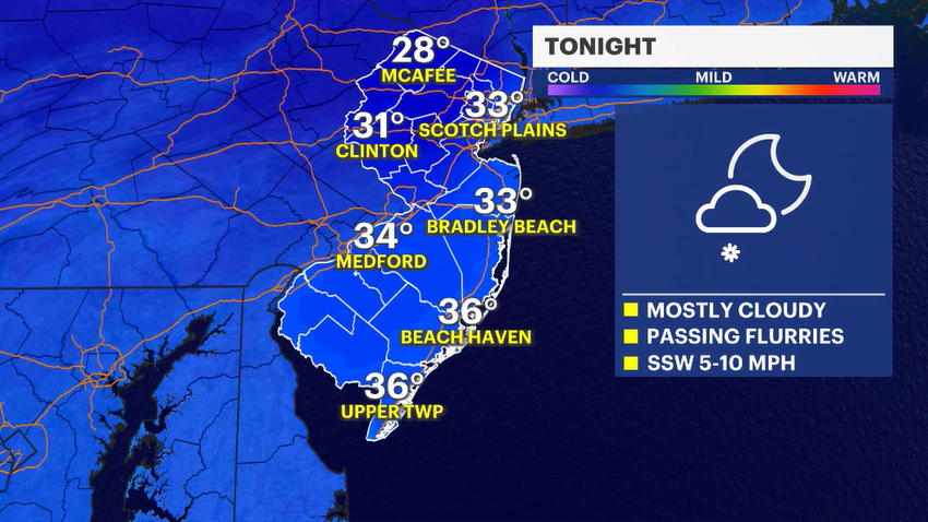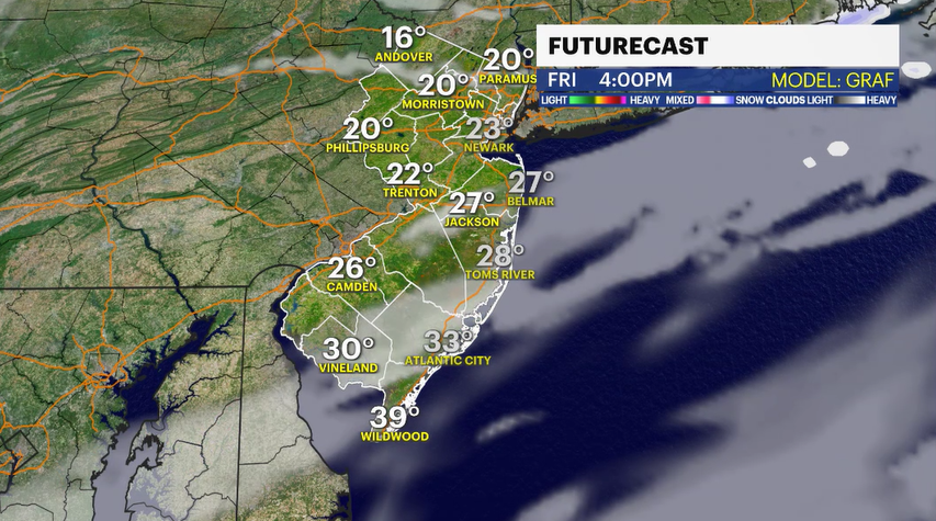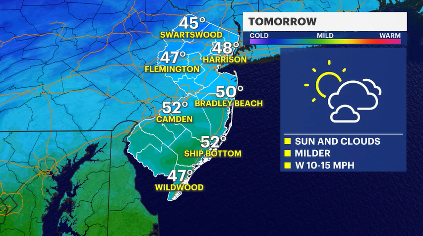 Thursday's forecast is pleasant, with a mix of sun and clouds. Temperatures will warm throughout the day with sun and a favorable wind. Look for highs in the lower 40s in northwestern New Jersey, mid-40s in central New Jersey and flirting with 50 degrees in the southern half of the state.