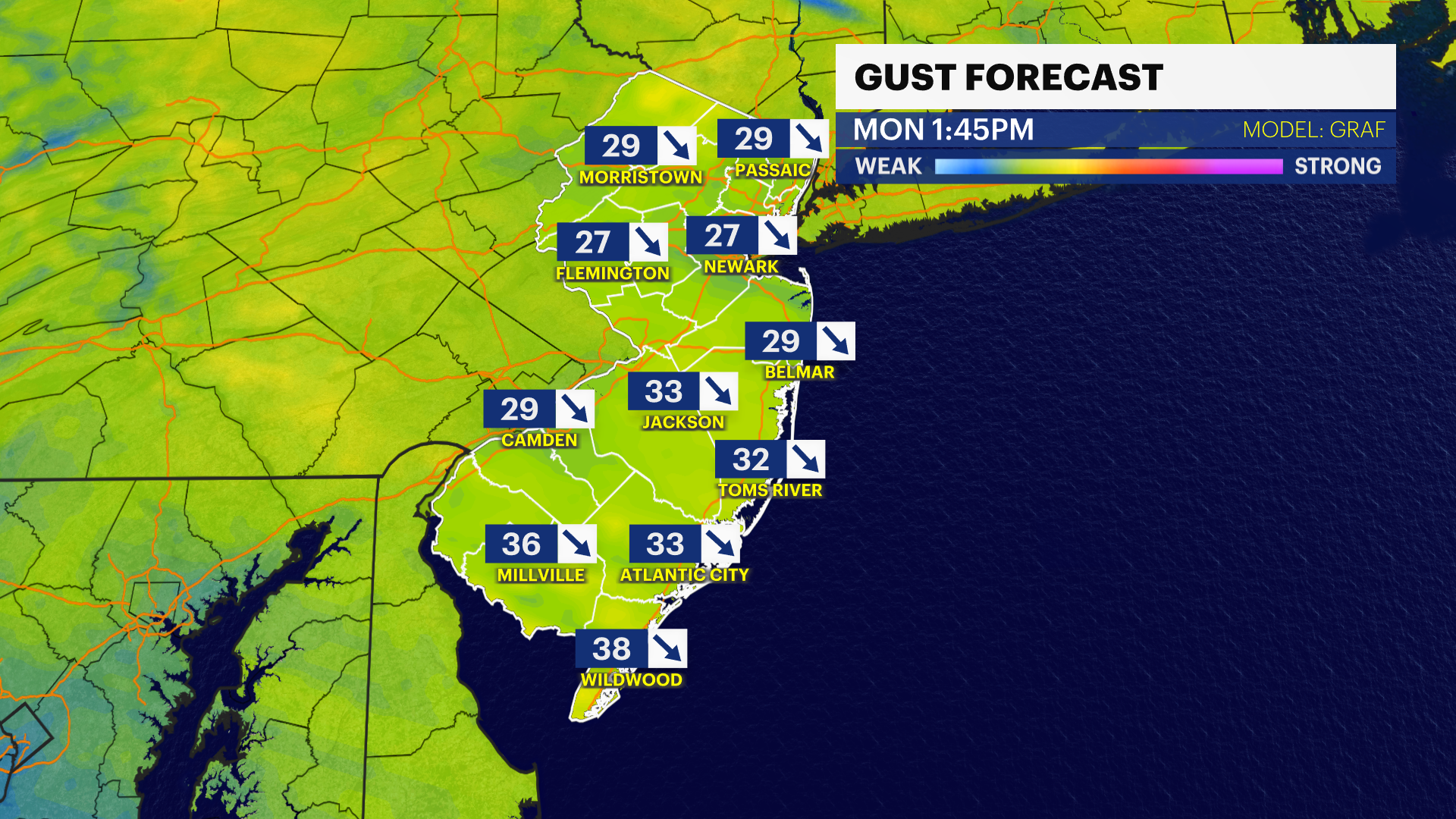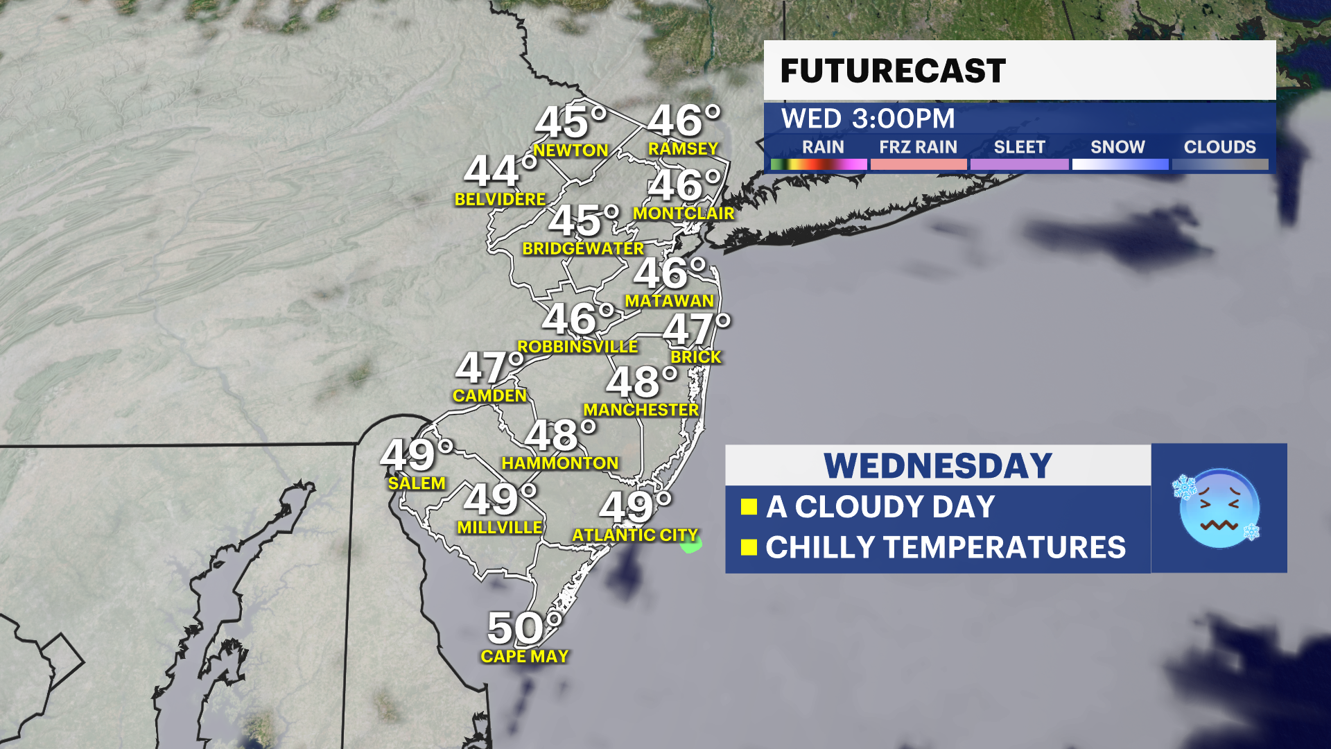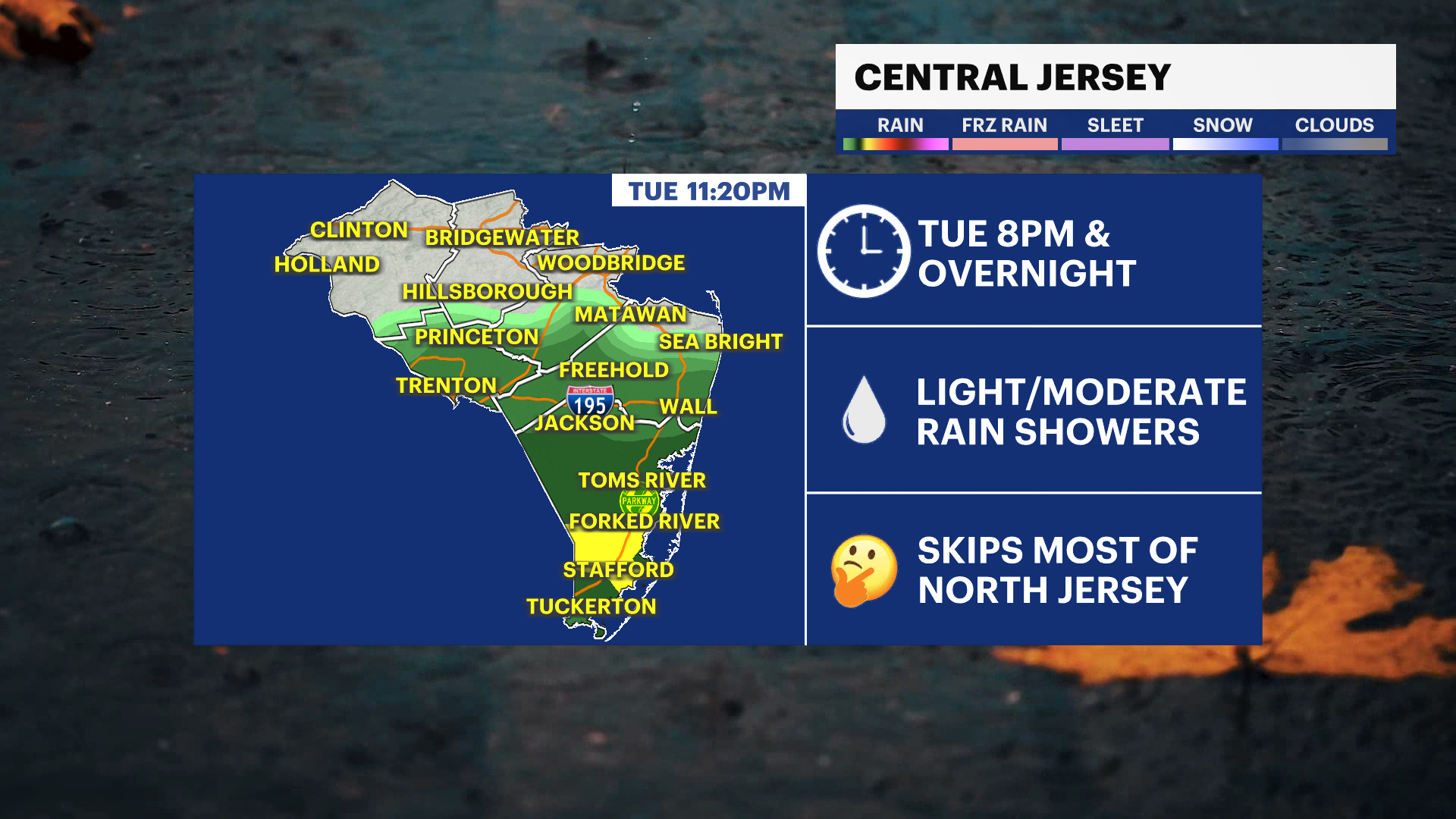 Rain arrives in central and southern areas of the state, especially Ocean County on Tuesday night. It rains overnight into Wednesday early morning ending before sunrise.