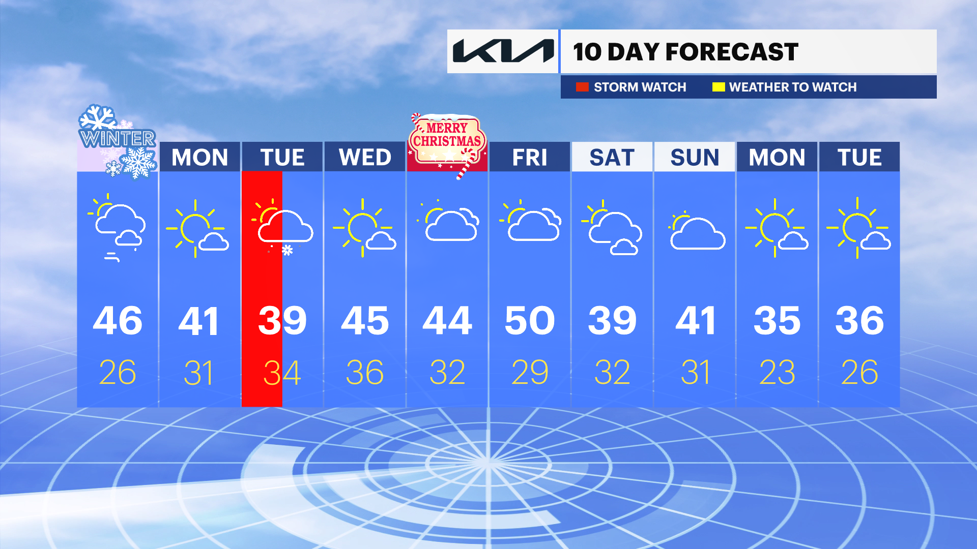 Christmas Day: Cloudy with a chance of rain. Highs in the mid 40s.