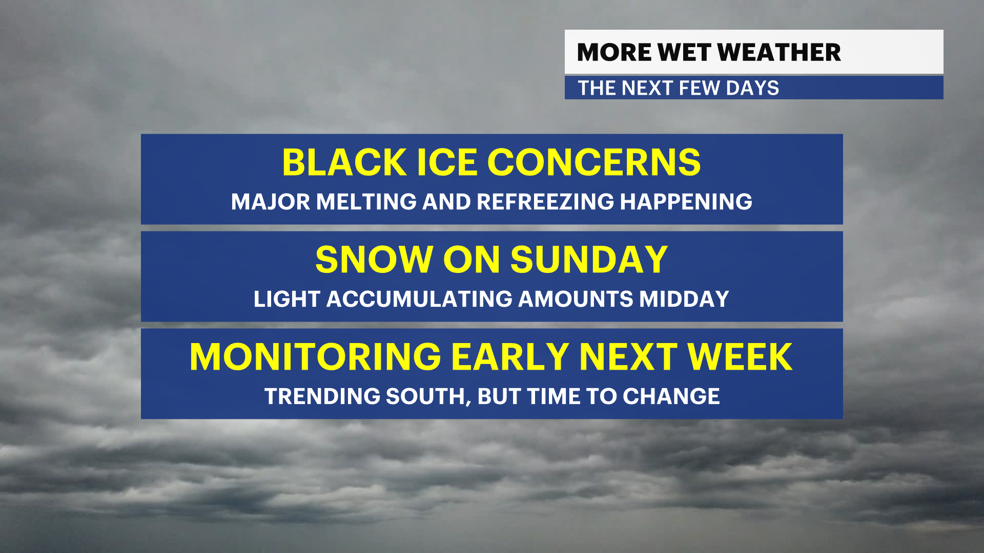 Temperatures are expected to dive over the next few hours. The could also be a stray shower, with raindrops or flurries during early parts of the overnight. Overnight temperatures will drop to the 20s, leading to refreezing and black ice concerns. Be aware of an increased chance of falling or sliding on icy spots.